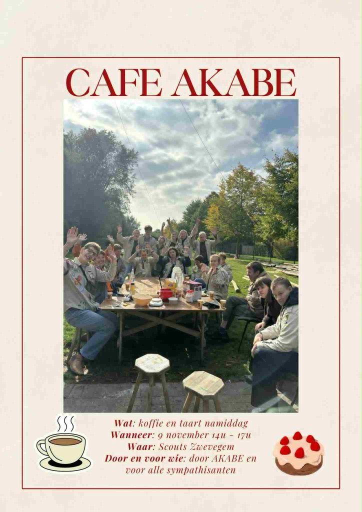 Op 9 november van 14u tot 17u organiseert de Akabe de eerste editie van CAFE AKABE. De leden zullen samen met hun leiding taartjes van de bakker, koffies en chocomelk verkopen tijdens hun vergadering.
